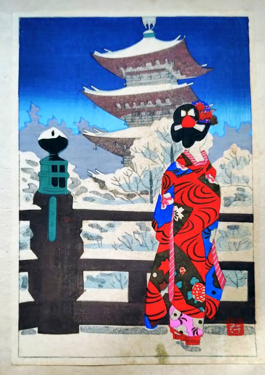 - f25042376〇彩色木版画 ハガキサイズ 京都 五重塔 錦絵 浮世絵 昭和年代〇和本古書古文書