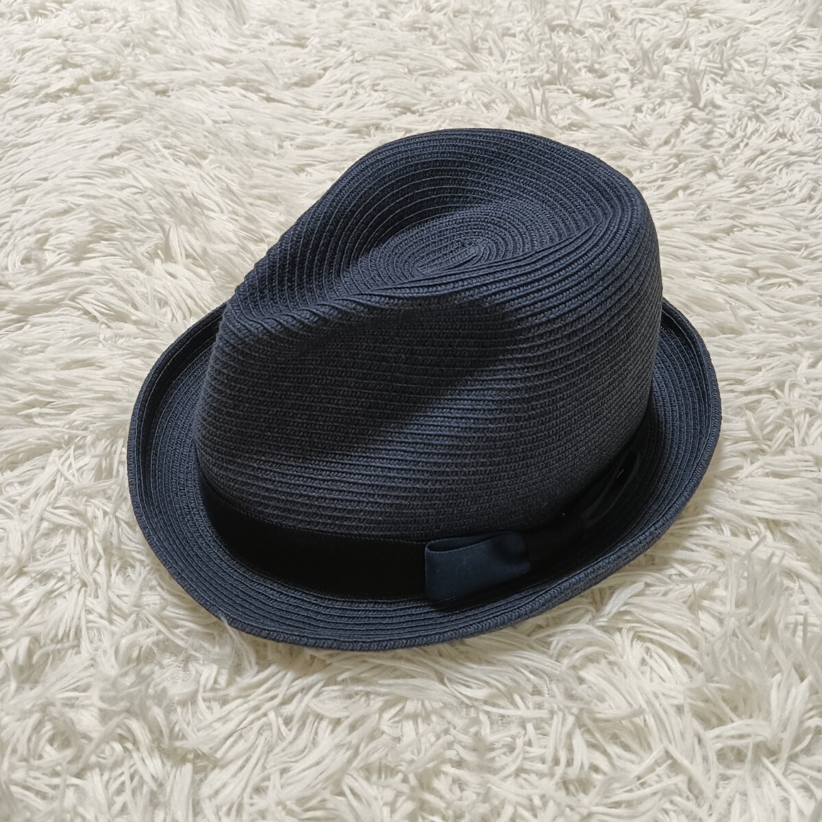 - 美品☆CA4LA カシラ ZKN01477 パナマハット ストローハット 中折れ 麦わら帽子 柔らかソフト系 ネイビー リボン付 未使用に近い 古着 USED