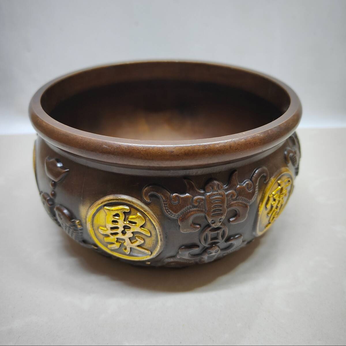 - ▽鴻▽ 黄銅製 塗金 五福聚寶盆 置物 賞物 古賞物 中国古玩 中国古美術