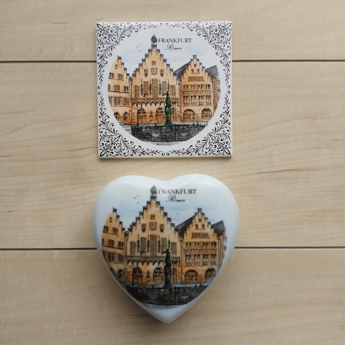 - ■『西獨逸(West Germany)陶器製のハート型小物容れ及び四角い壁掛け~孰れもFrankfurt 旧市庁舎の絵柄』2点一括。1985年現地で購入。