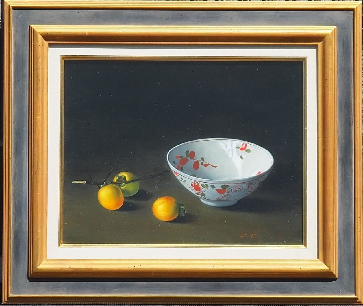 - 【真作】 九鬼三郎 絵画 ≪器に柿≫ ●リアリズム 静物画 ◆古陶に花 油彩画 6号 人気画家 『絵画買取 小川処堂』