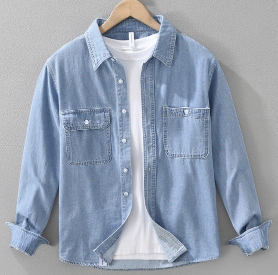 - 春秋新作 メンズ 綿製 無地 シンプル デニムシャツ 長袖 ワークシャツ カジュアル アウター ブルー/L
