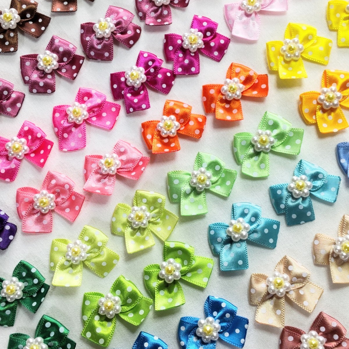 > 50個 9 水玉柄ビーズ付き サテンリボン リボンモチーフ ハンドメイド