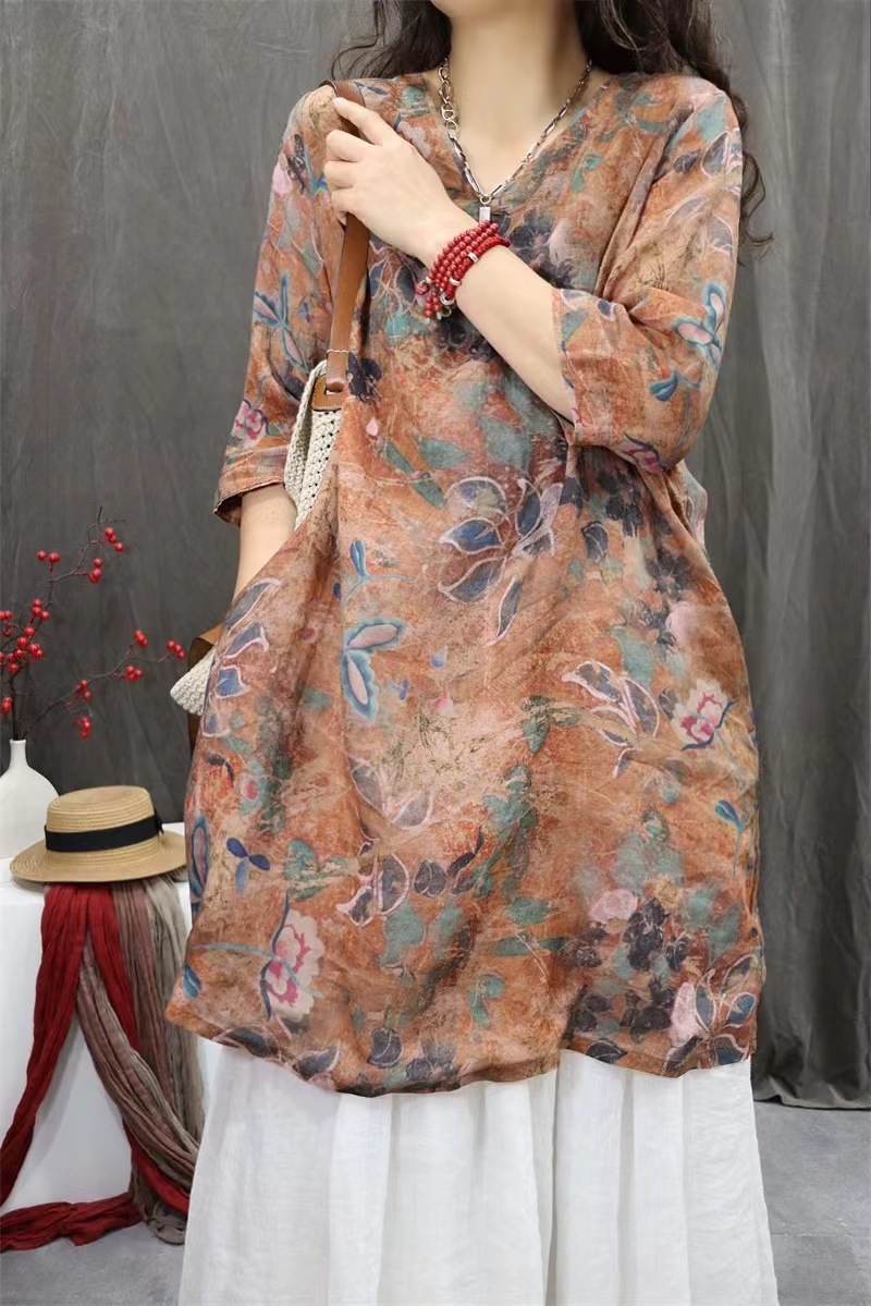 - お色選択可上質 チュニック レディース 長袖 ロングシャツ プリント柄 トップス 体型カバー ゆったり 通勤 お洒落 シャツワンピース カーキ