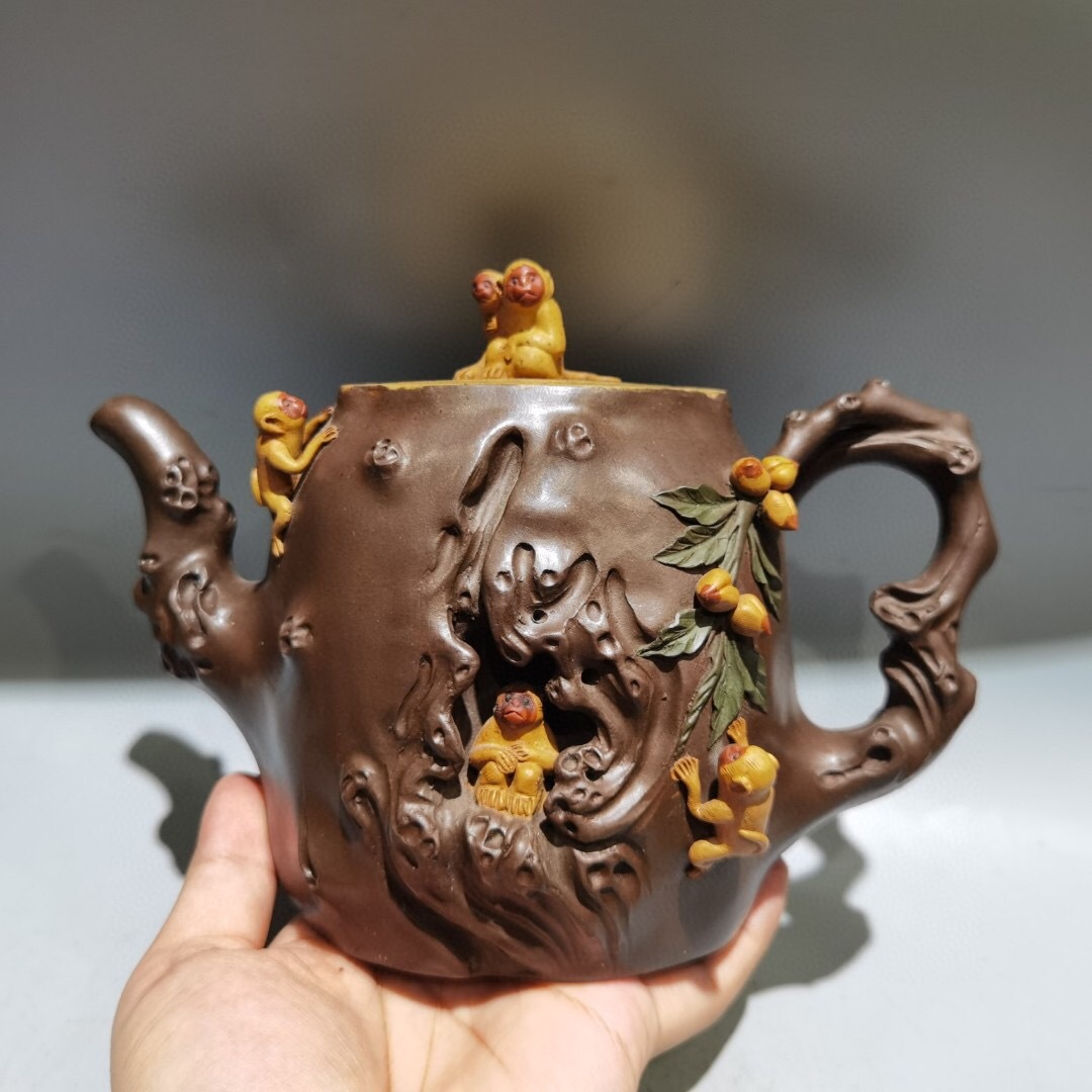 - 『館蔵珍品 紫砂壺 靈猴獻桃壺 汪寅仙款 黄段砂 紫砂壺』置物 賞物 貴重物品 収蔵品 中国古美術