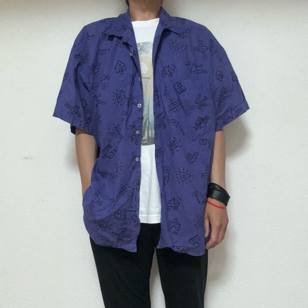- ビンテージ90s SPIRIT SPORT落書きアート柄オープンカラーシャツL