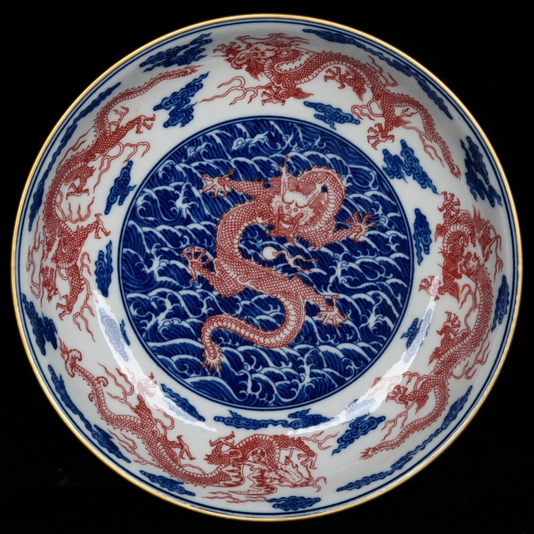 - 【超珍館蔵】清 雍正年製款 古陶瓷品 青花 紅釉 海水九龍紋 供盤 置物 古賞物 古美術品 稀少珍蔵品