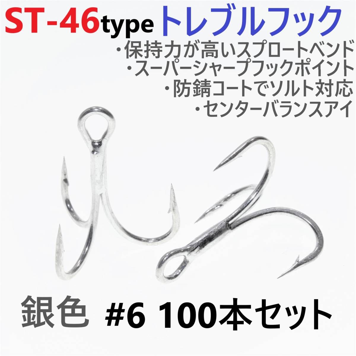 - 【送料210円】ST-46タイプ防錆トレブルフック シルバー#6 100本セット 高品質ルアーフック スプロートベンド ソルト対応 トリプルフック