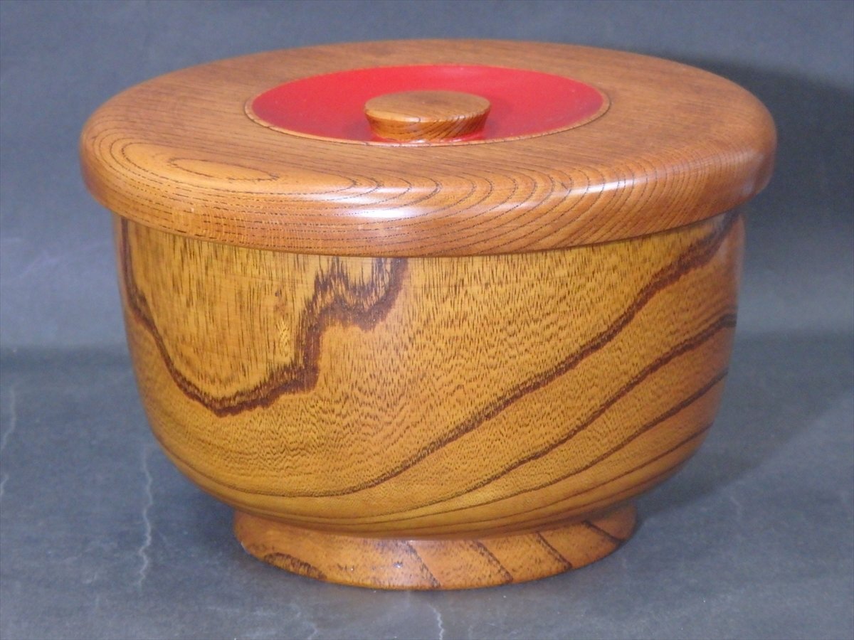 - ★美品!天然木【小さなおひつ】拭き漆塗り 蓋が朱塗り 直径21cm 高さ13.2cm 紙箱に印あり 蓋付き菓子器? 飯櫃 和食器