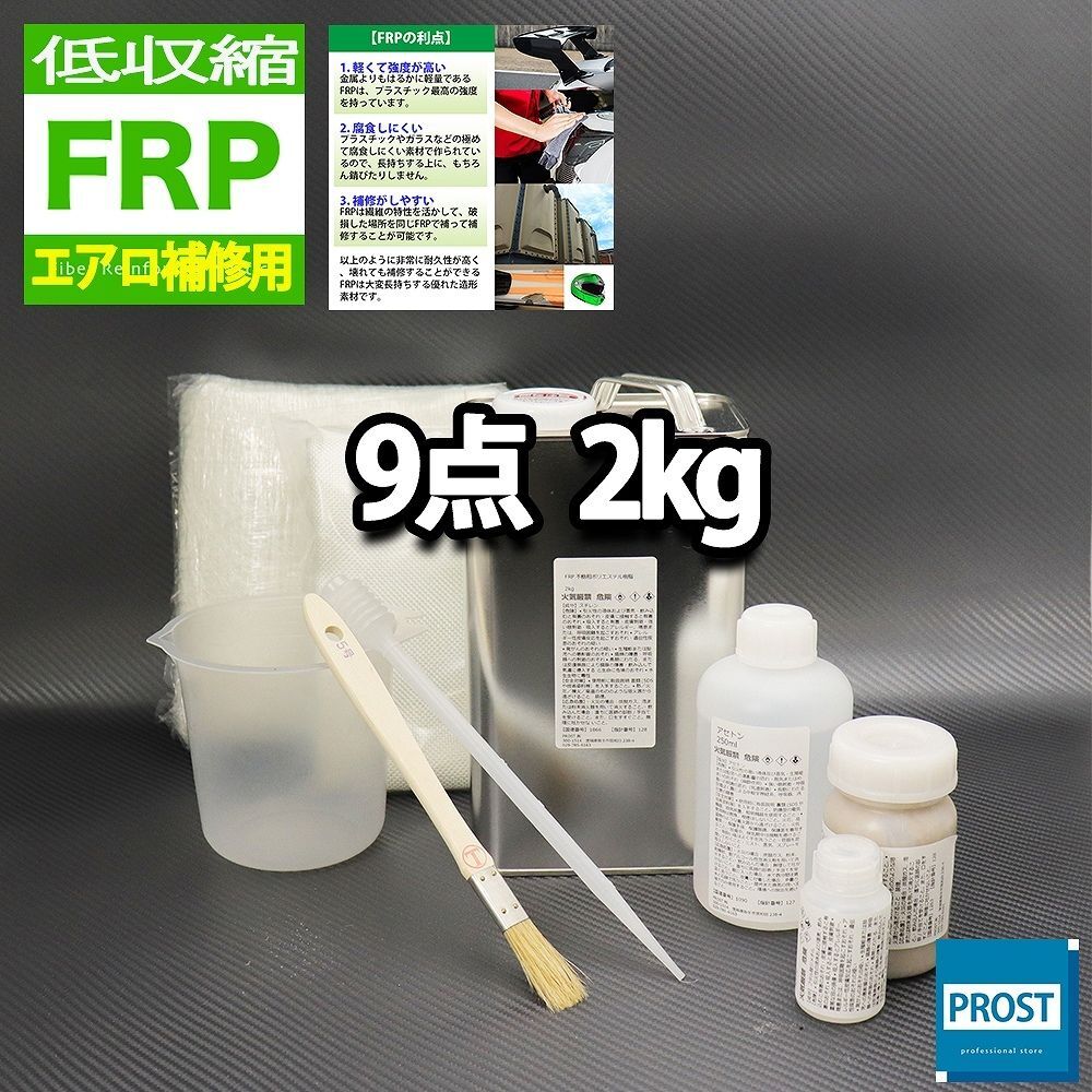 - 低収縮タイプ FRPエアロ補修9点キット 樹脂2kg 一般積層用 インパラフィン 硬化剤 ガラスマット アセトン パテ クロス 道具付き Z26