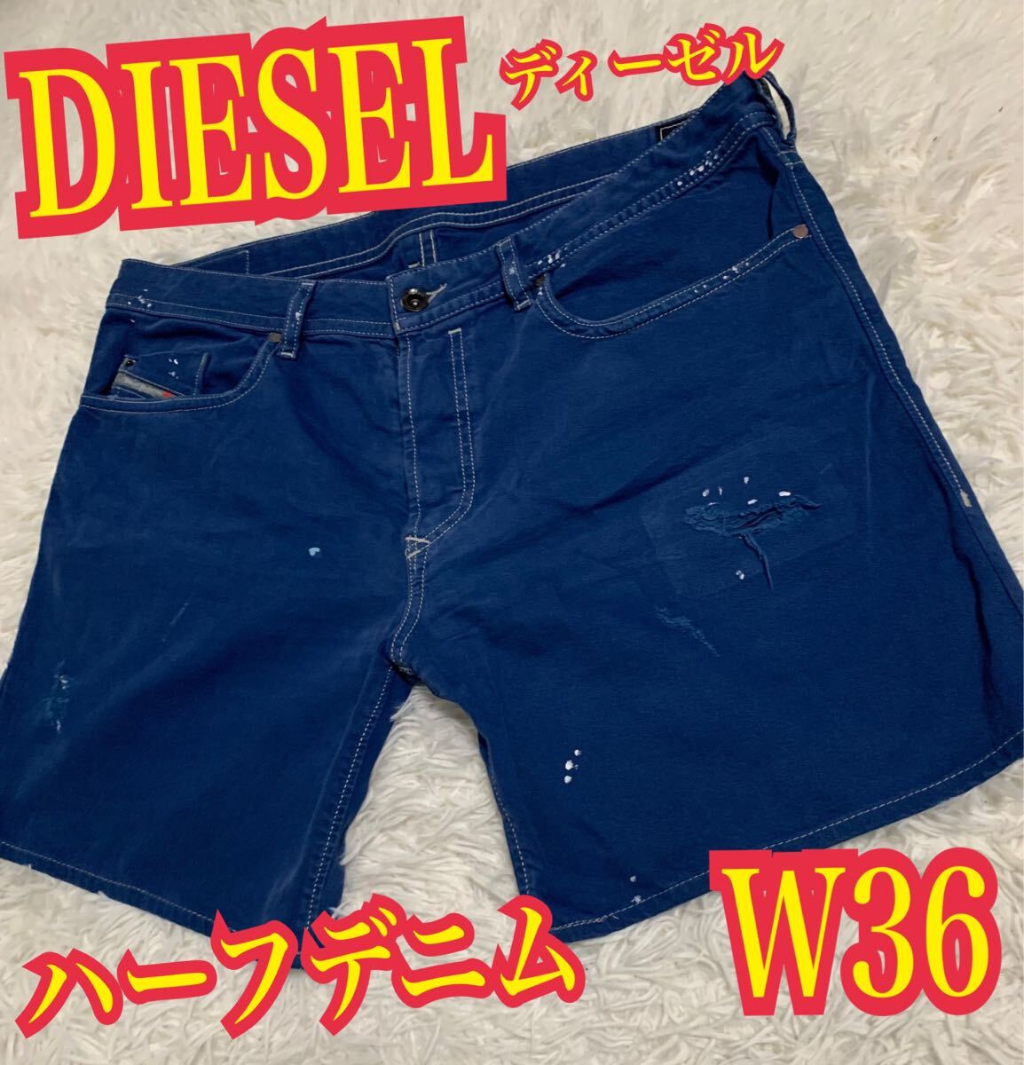 - DIESEL ディーゼル ハーフデニム 短パン ダメージリペア ペイント加工 BLUE W36