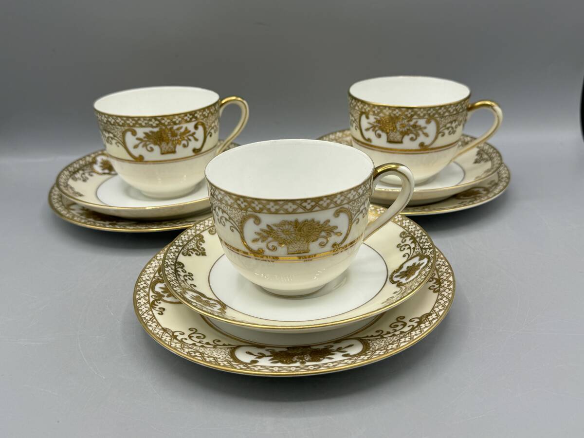 > 里帰り ノリタケ フラワーバスケット 3客 トリオ カップ&ソーサー 皿 ケーキ皿 サイドプレート 金彩 お花 カップアンドソーサー (#14)