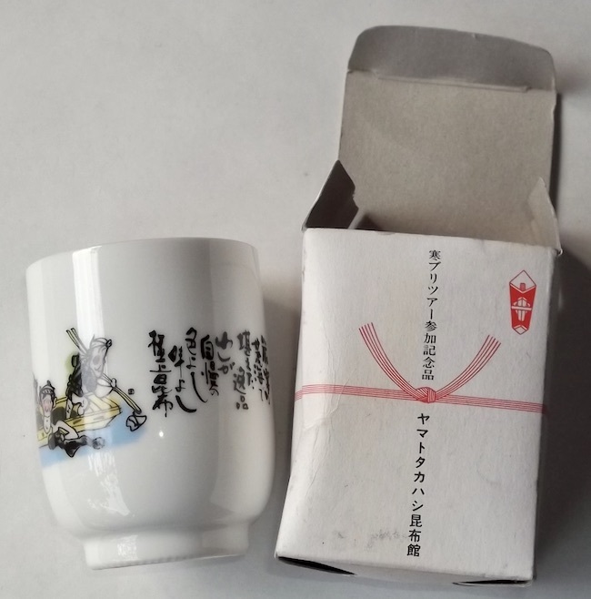 - 古い 湯飲み ヤマトタカハシ昆布館 ノベルティ 寒ブリ ツアー 記念品 イラスト 漁師 昆布漁 漫画 福井県 ご当地 昭和 レトロ