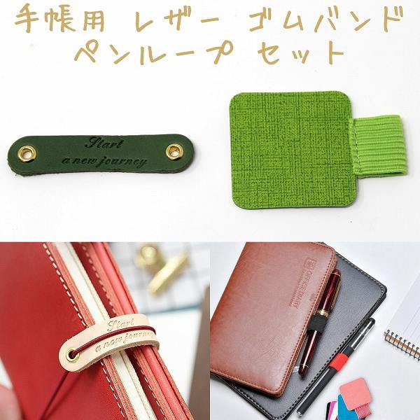 - 「bzc-a2」 手帳用 レザーチャーム ゴムバンド ペンループ セット ペンホルダー 日記帳 Appleスタイラスペン グリーン