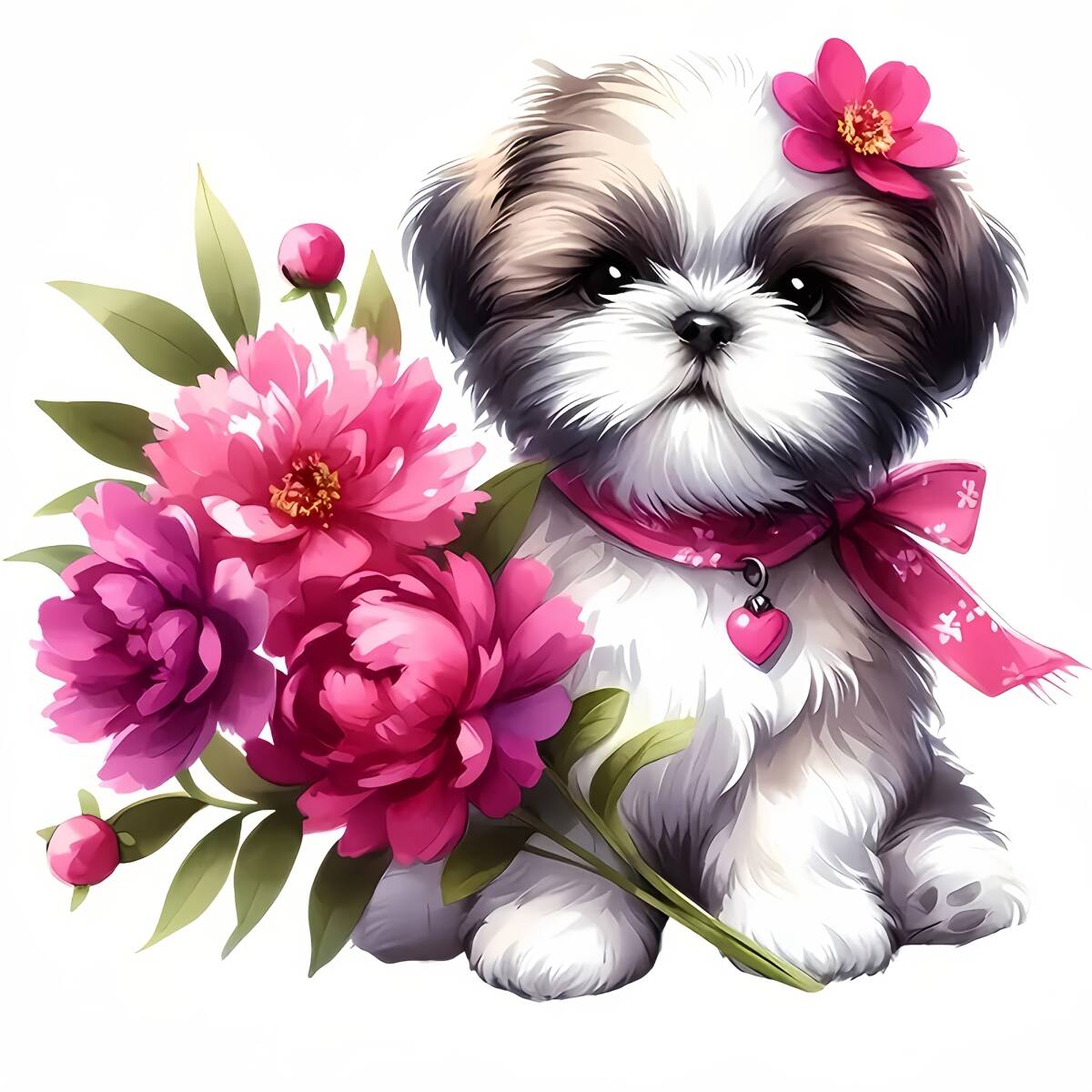 - ステッカー 花飾りをつけたシーズー 犬 車用 ビニール シール 13cm ピンクの花 イヌ かわいい おしゃれ 2D 窓用ステッカー 防水 いぬ t6308