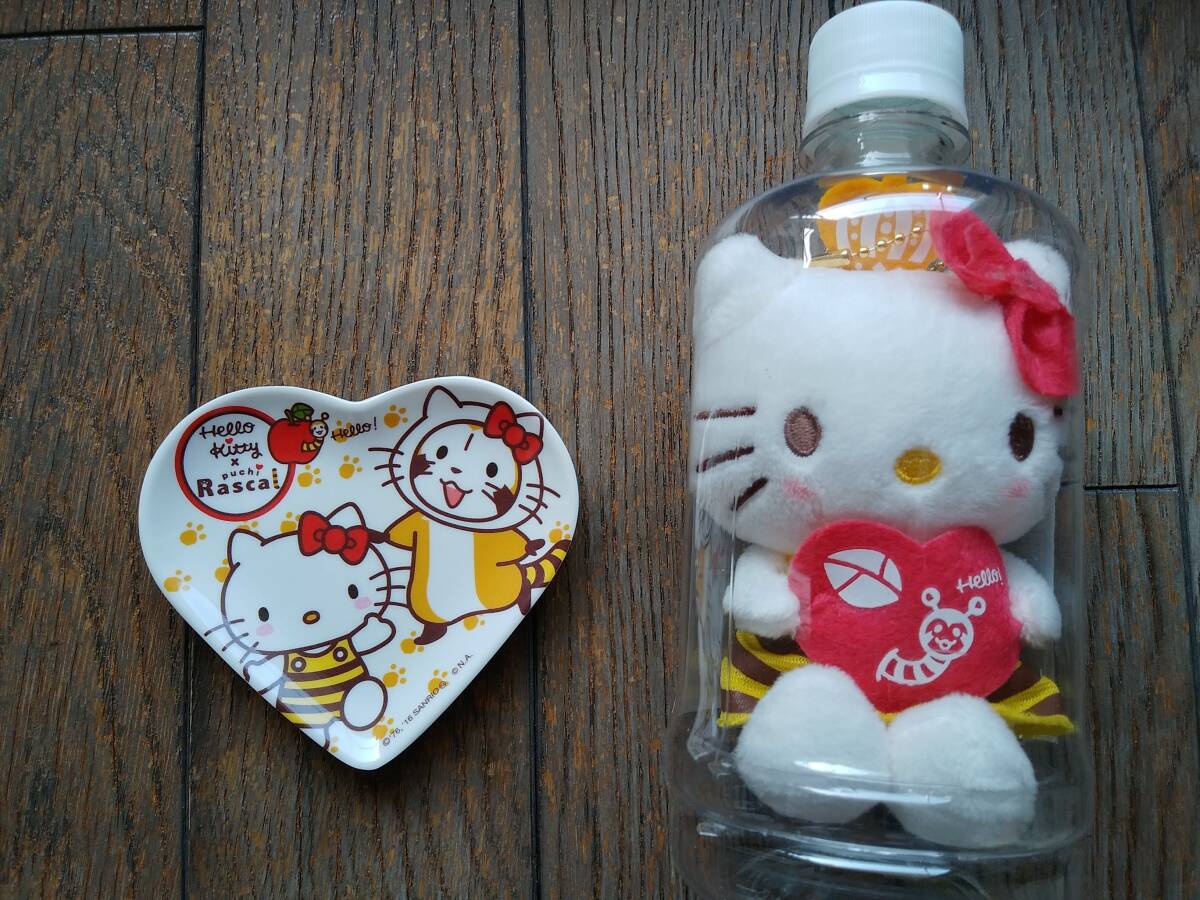 - ♪ハローキティ♪Helo Kitty♪ボトル入りクラウン(王冠)ボールチェーン付きぬいぐるみマスコット&あらいぐまラスカルコラボ豆皿ハート♪