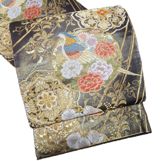 - 袋帯 中古 リサイクル 正絹 フォーマル 仕立て上がり 六通 花鳥の図 雪輪 蝶 花紋 華文 引箔 鼠系色 多色 金 きもの北條 A1187-9