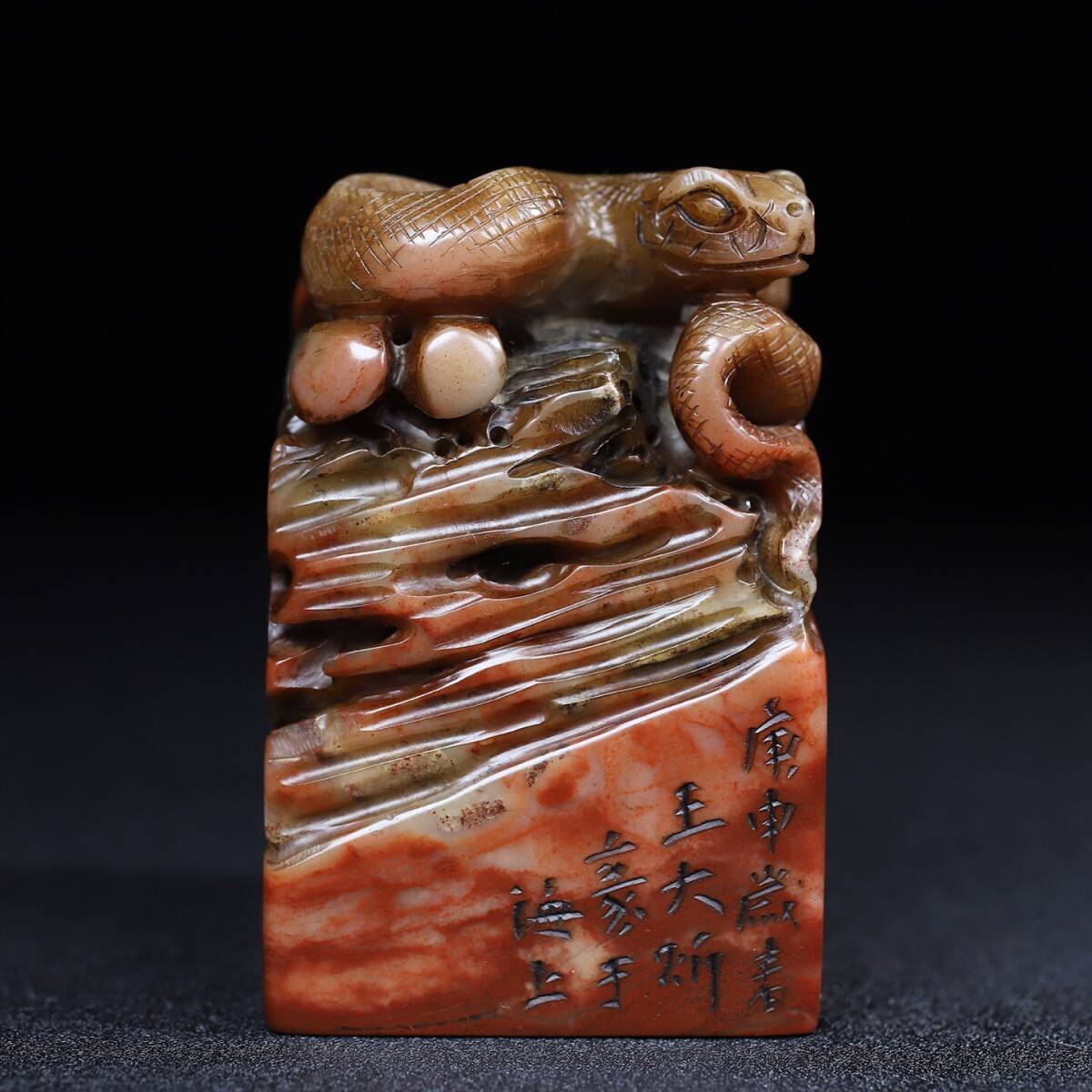 - 【超珍館蔵】寿山石 芙蓉石 細密彫 靈蛇獻瑞印章 文房具 書道品 古賞物 古美術品 稀少珍蔵品