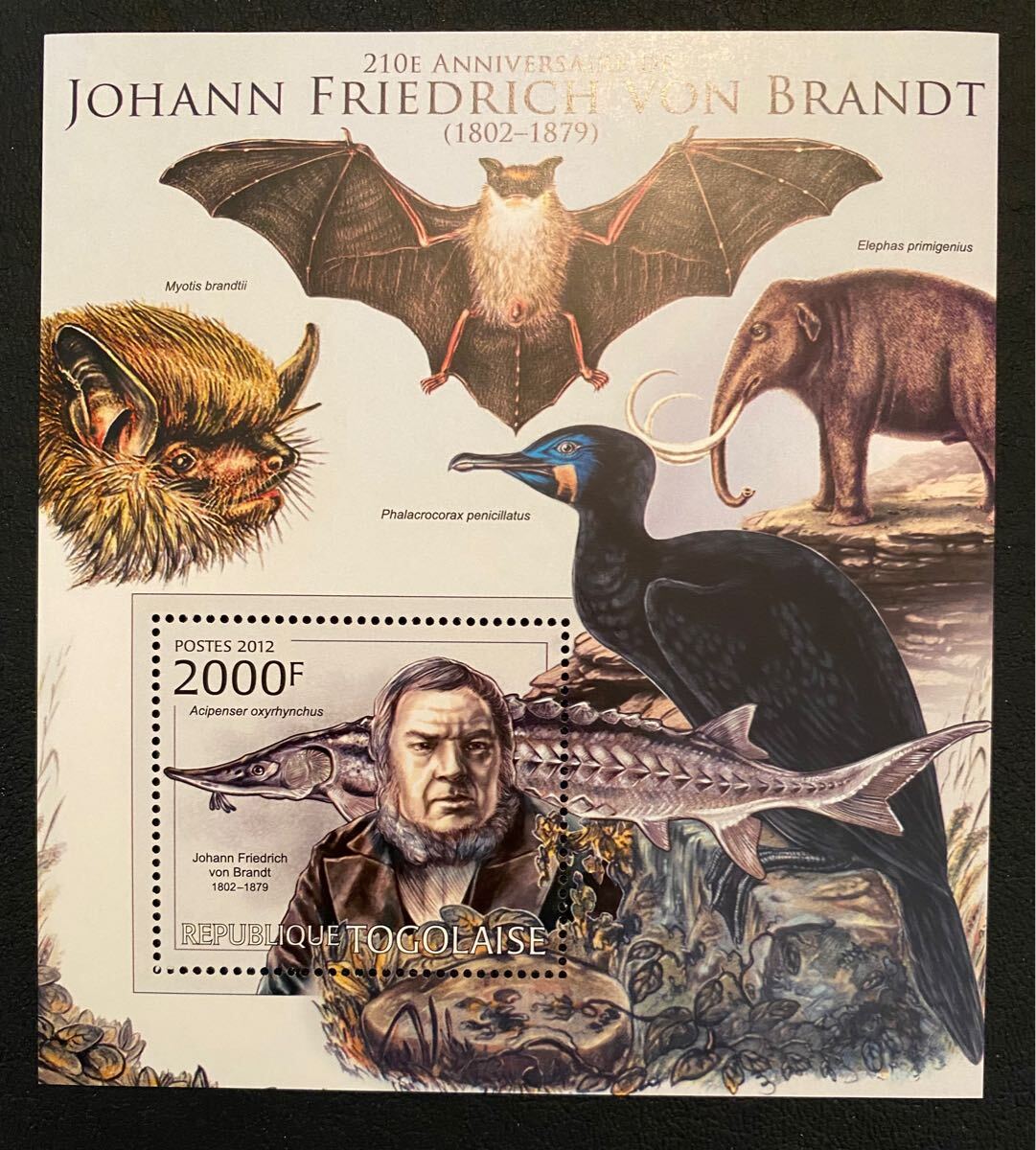 - トーゴ ヨハン・フリードリヒ・フォン・ブラント 博物学者 コウモリ マンモス ウミガラス チョウザメ 小型シート1種 未使用 NH