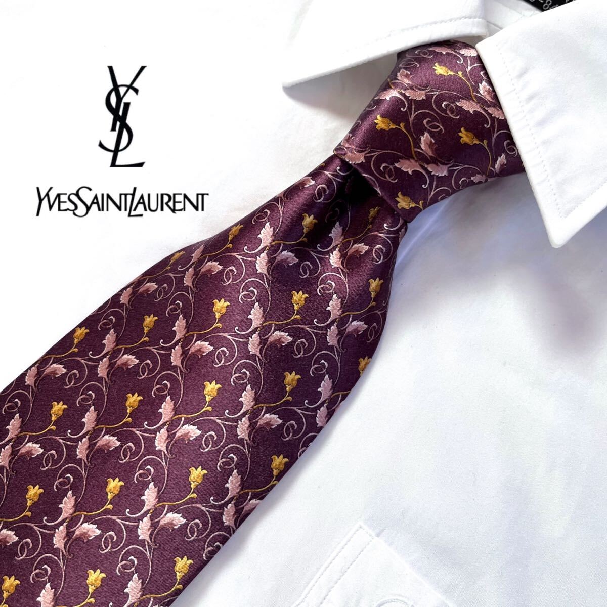 > 美品 YVES SAINT LAURENT イヴサンローラン シルク 絹 ネクタイ 日本製 花柄 ビジネス カジュアル フォーマル ブランドネクタイ ボルドー