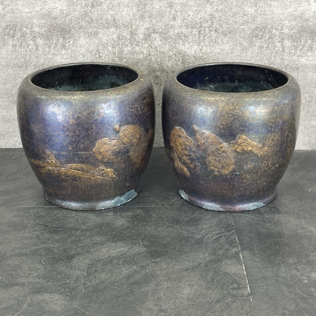 - 新潟県燕 志のぶ 銅製 火鉢 2点セット 亀 茶道具 約 25/25/23cm 1個1.3kg /5102077