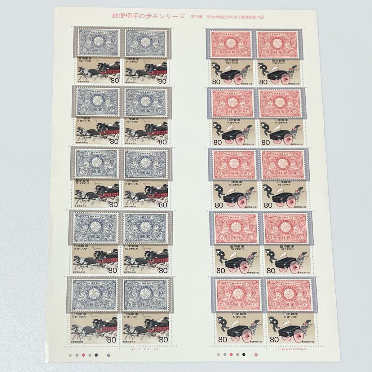 > 郵便切手の歩みシリーズ 第3集 特殊切手 記念切手 80円切手20枚★明治大婚記念切手と郵便取り扱いの図 新品 未使用 切手シート 平成7年