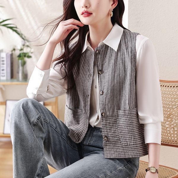 - レディース トップス ブラウス フリル ノースリーブ ストライプ柄 カジュアル EY59