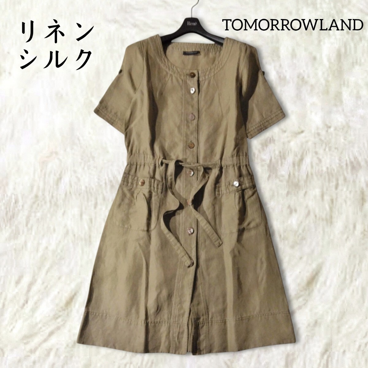 - 63 【TOMORROWLAND】 トゥモローランド 麻 リネン 絹 シルク 半袖 ワンピース 38 M ベージュブラウン 春夏 ひざ丈 膝丈 前ボタン 羽織り