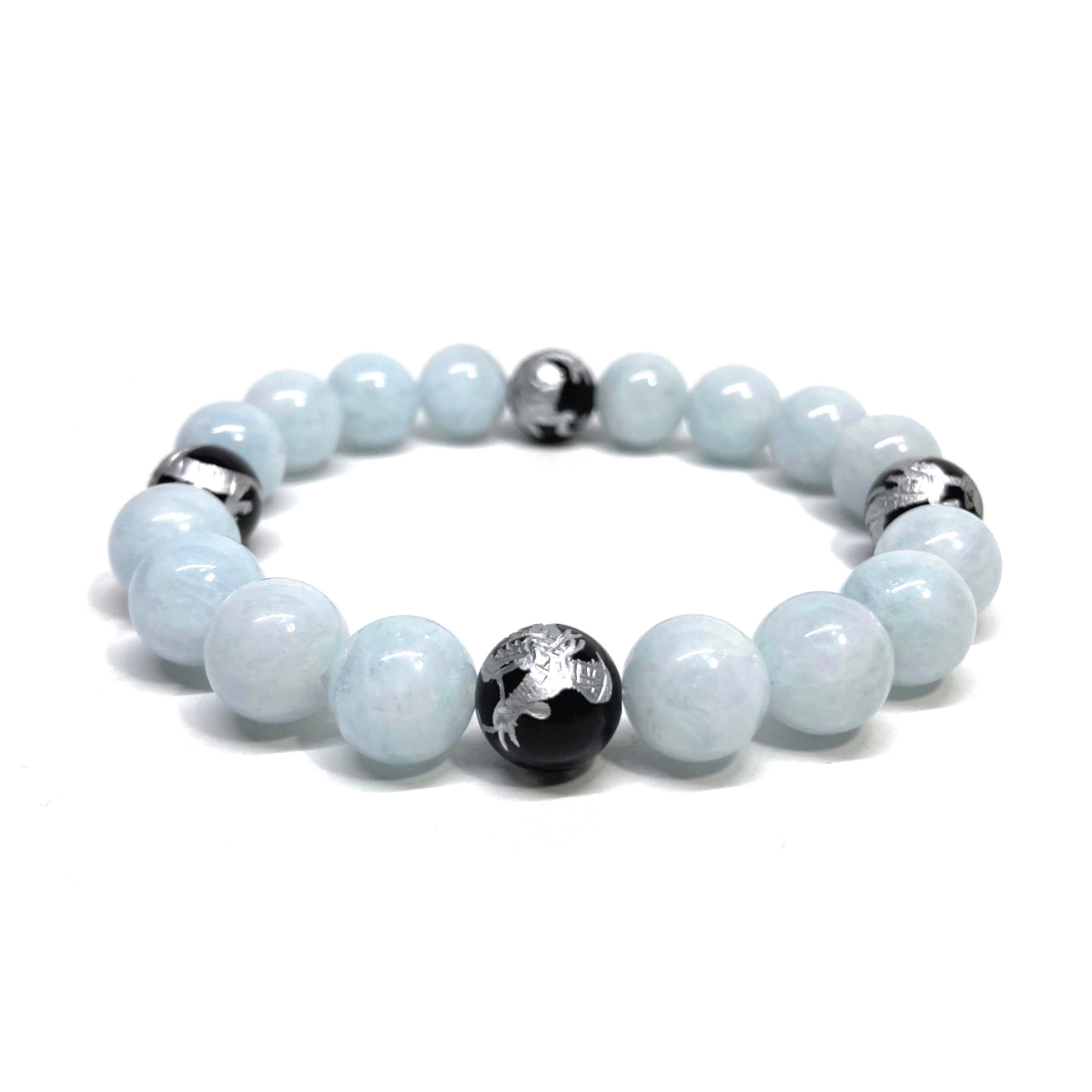 - 10mm 四神獣銀彫オニキス×アクアマリン パワーストーン ブレスレット天然石 運気上昇 開運 幸運 恋愛運 青龍 白虎 玄武 朱雀 ☆
