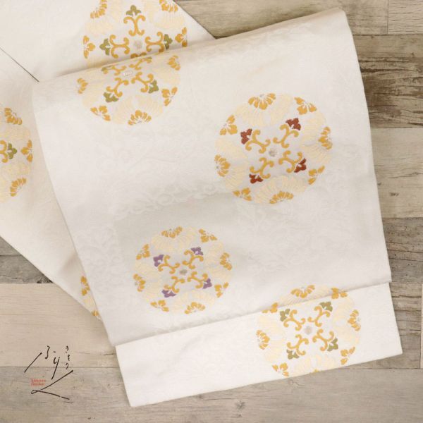 - 【名古屋帯】 菊唐草の丸 市松の地模様 白灰色 正絹着物 レディース NS2-28