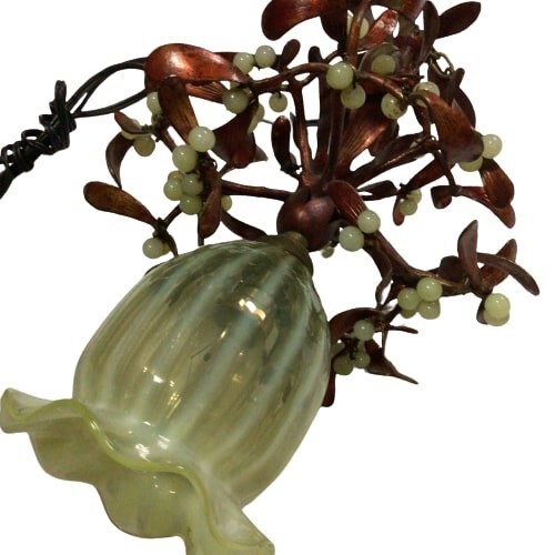 1920年代頃の美しいフレンチ・アールヌーボーのヤドリギのシャンデリア照明器具。ブロンズにハンドペイントが施され、実の部分はオパリンガラスでできています。