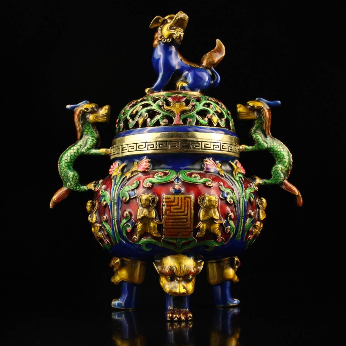 - 蔵友旧蔵出 銅製 景泰藍 琺瑯彩 三獣足雙龍耳 獣蓋熏香爐 密宗密教 供養品 仏教美術品 中国時代美術品