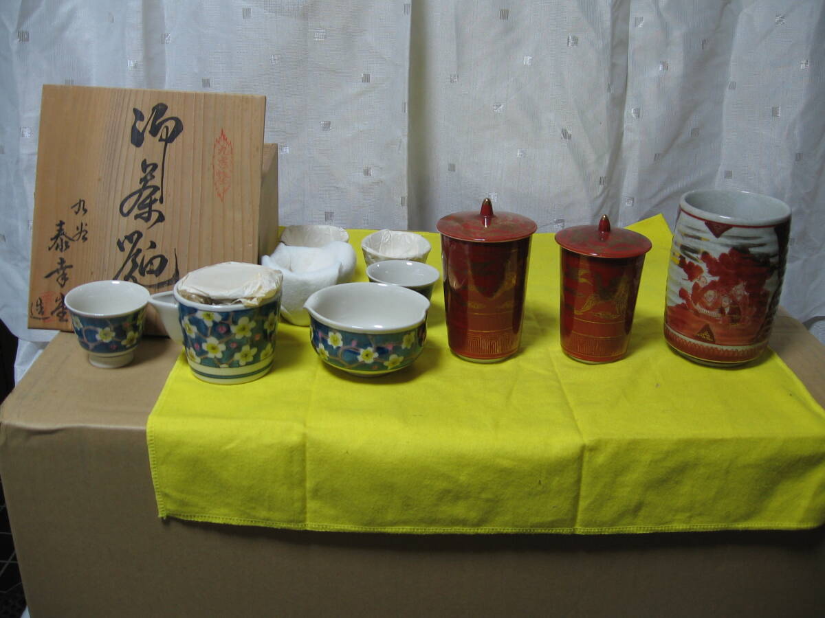 - 九谷焼3点☆①夫婦湯飲み、永楽の銘入り②湯飲み、庄三の銘入り③茶器セット☆中古品