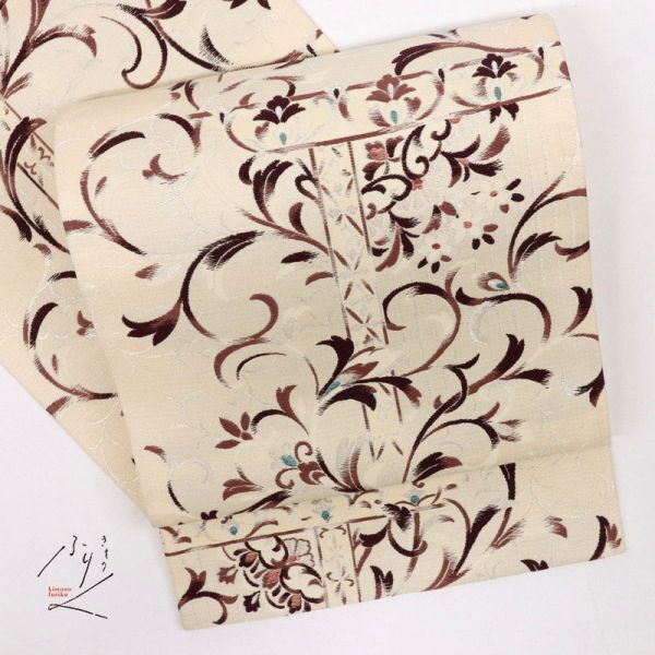 - 特選 袋帯 シンプル花唐草模様 アイボリー 六通柄 正絹着物 レディース FY3-12
