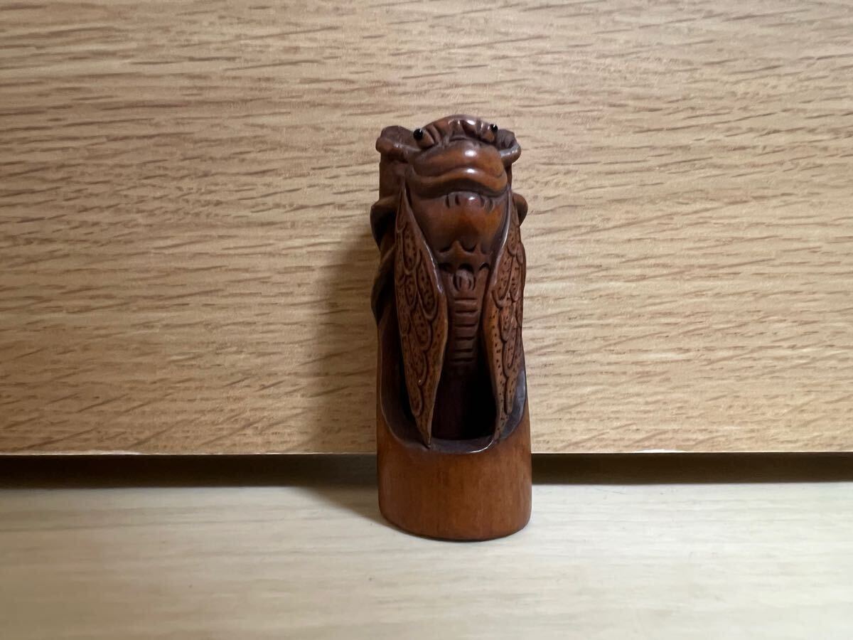 - 木彫り セミ 蝉 超絶技巧 置物 フィギュア 当時物 根付け 銘入り 光玉 在名