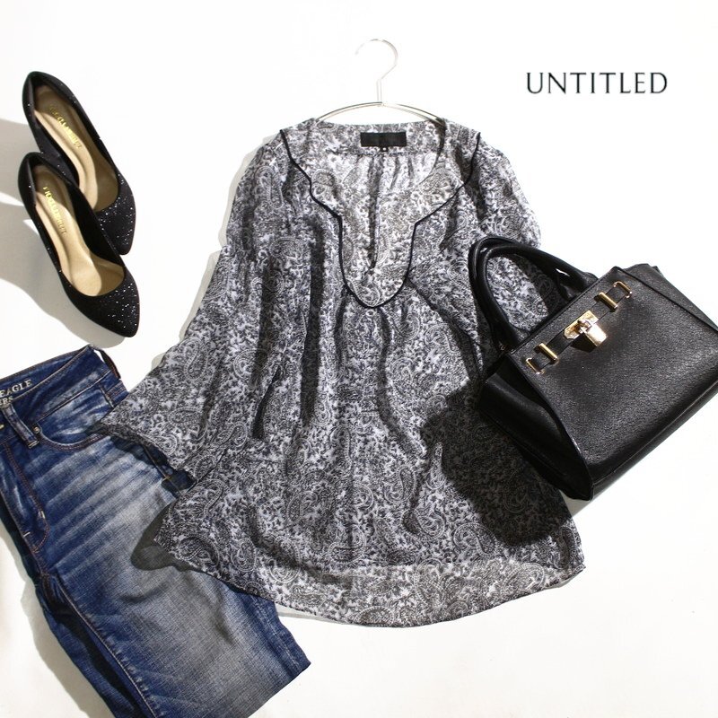 > 美品 アンタイトル UNTITLED 株)ワールド 春 夏 ペイズリー 柄 プリント ミセス シフォンブラウス シフォンカットソー 0 ブラック ブラウス