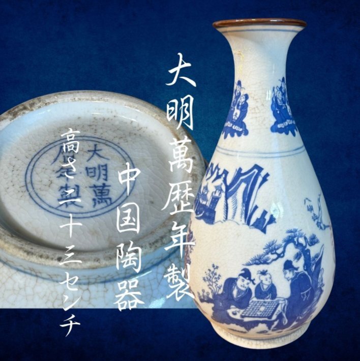 - S8027 大明萬歴年製 花瓶 花器 染付 山水 フラワーベース 花池 青花 ヤマト80サイズ