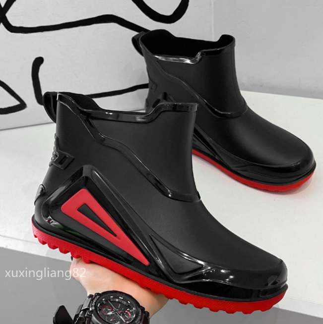 - レインシューズ 新品 レインブーツ ショット丈 メンズ 作業靴 登山靴 梅雨 防水 防滑 通学通勤 アウトドア 黒赤/27cm