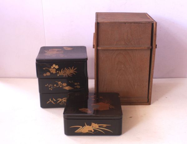- レトロ 木製漆器 お重 四段重 重箱 蓋2枚 松竹梅 木箱入 小物入れとして/25N4.17-53