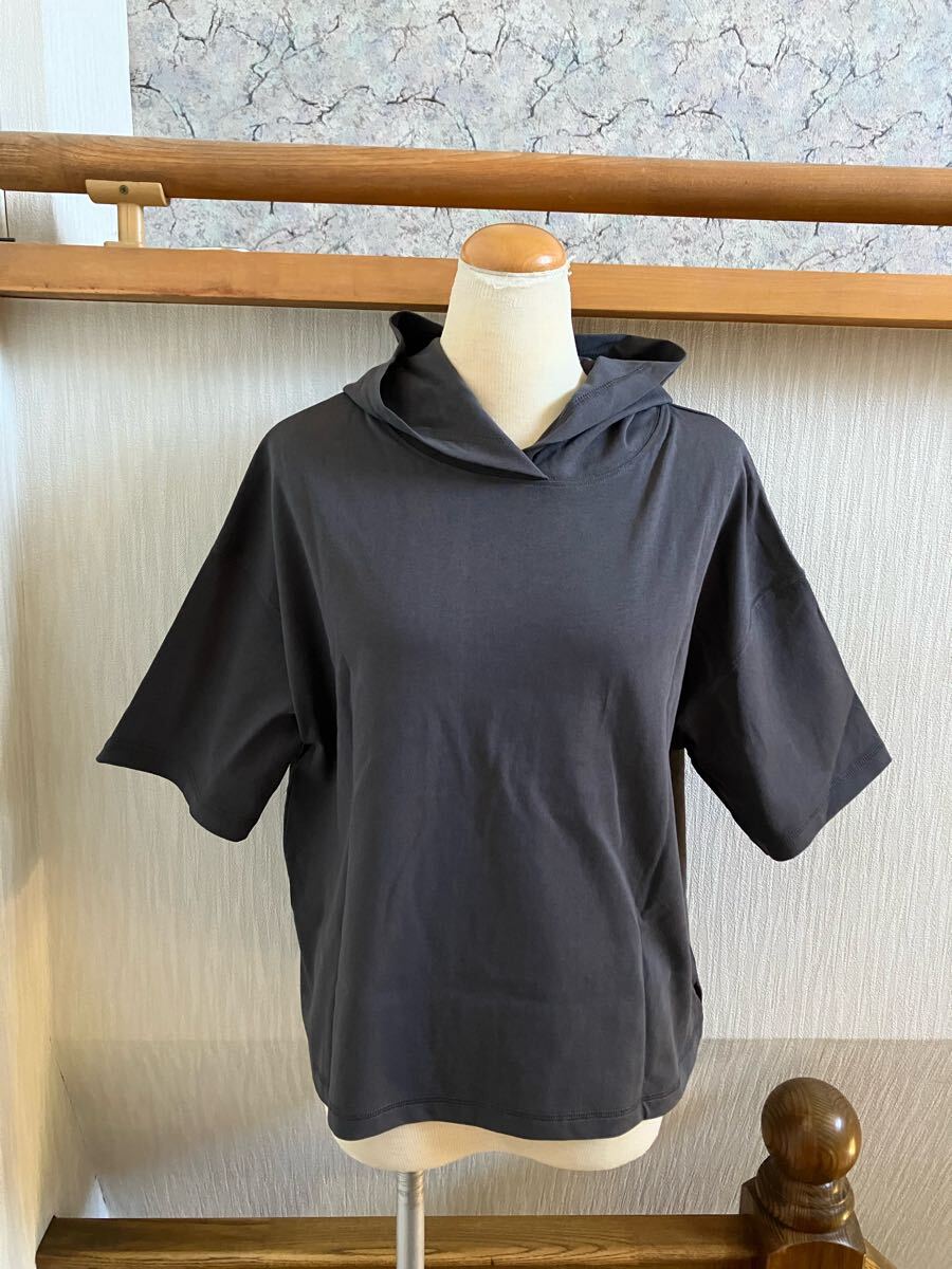 - 未使用★トップバリュ濃グレー オーガニックコットン5分袖フード付ゆるTシャツM★