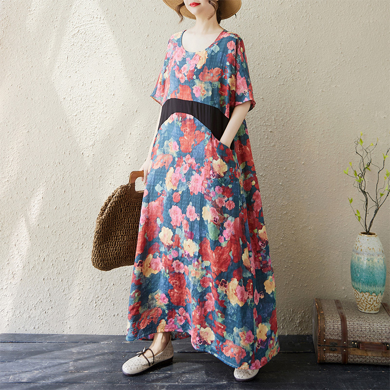 - 新入荷*ワンピース レディース 大きいサイズ マキシワンピース ゆったり プリント柄 切り替え 配色 体型カバー 半袖 ロングワンピース*6@