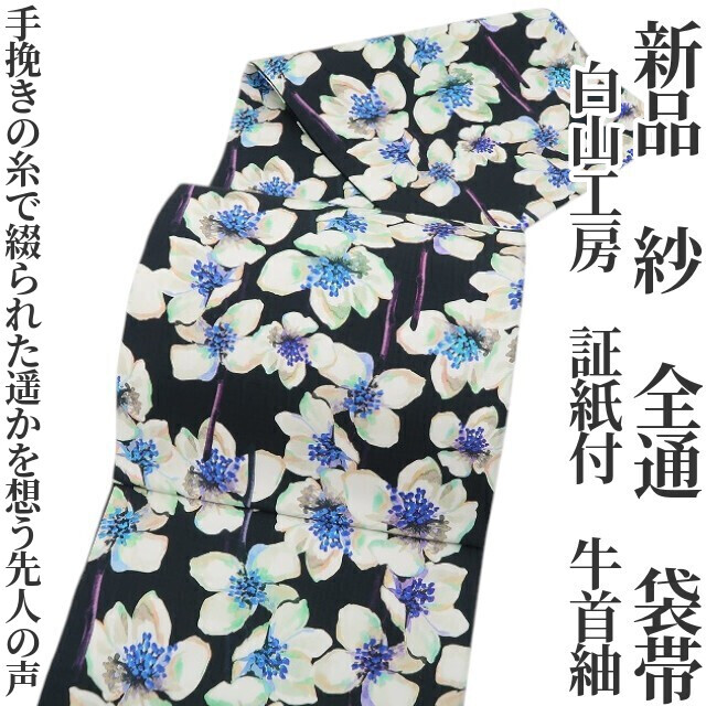 - tomihisa 新品 白山工房 紗 夏着物 正絹“手挽きの糸で綴られた遥かを想う先人の声”証紙付 牛首紬 全通 袋帯 5828