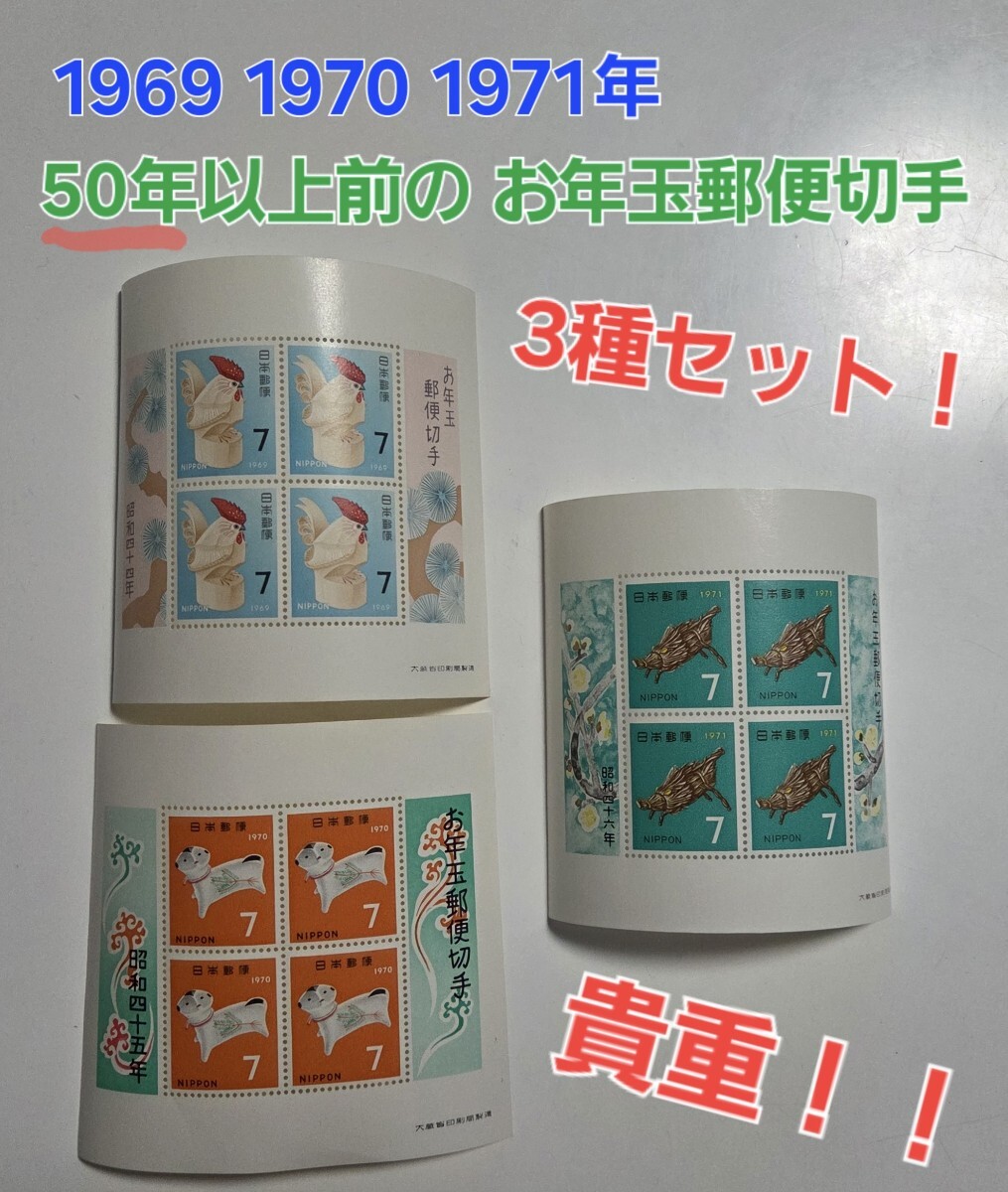 - 50年以上前のもの!! 貴重 希少 お年玉郵便切手 1969 1970 1971 3種セット!! 額面 合計 84円 未使用 切手シート 昭和 酉年 戌年 亥年