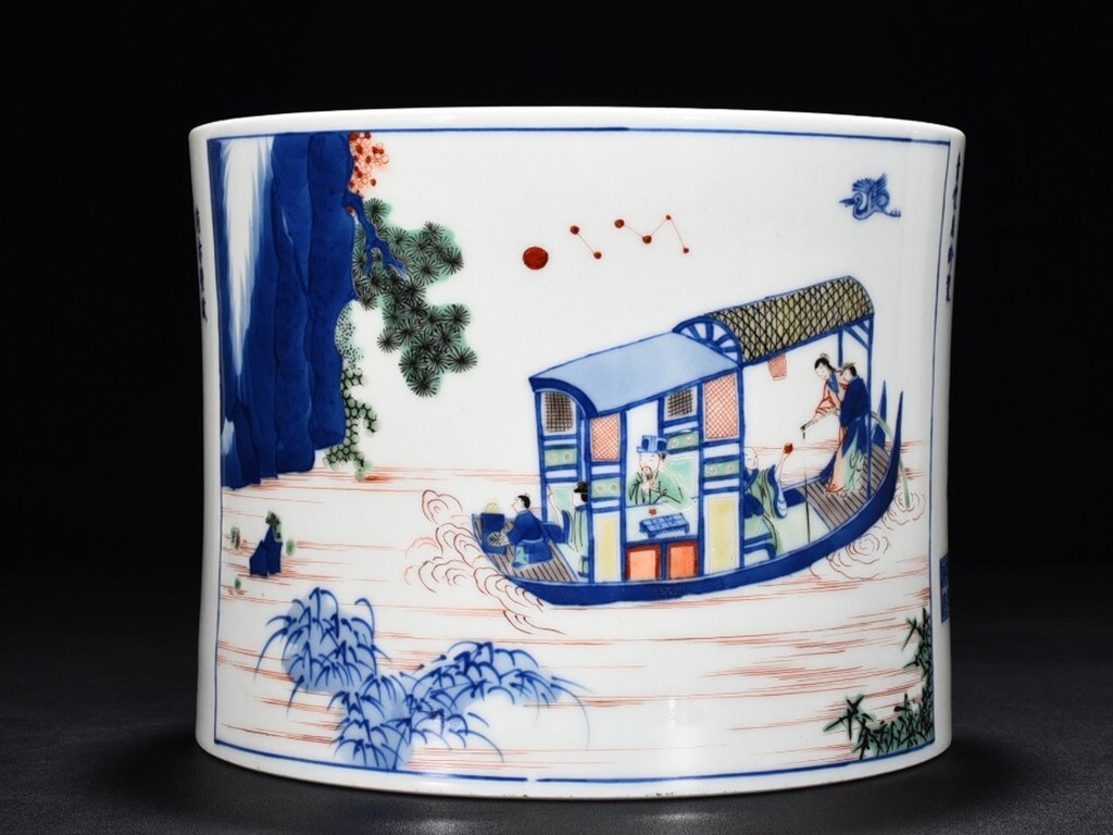 > TB121■中国古玩 唐物 大清康熙年製 款五彩夜遊赤壁人物紋筆筒 時代物 極上品■高さ15cm・直径19cm■