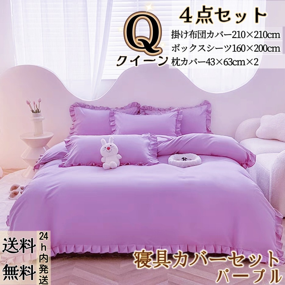 - クイーン 布団カバー 4点セット 寝具カバーセット 掛け布団カバー ボックスシーツ 枕カバー 洋式 和式 兼用 フリル付き パープル