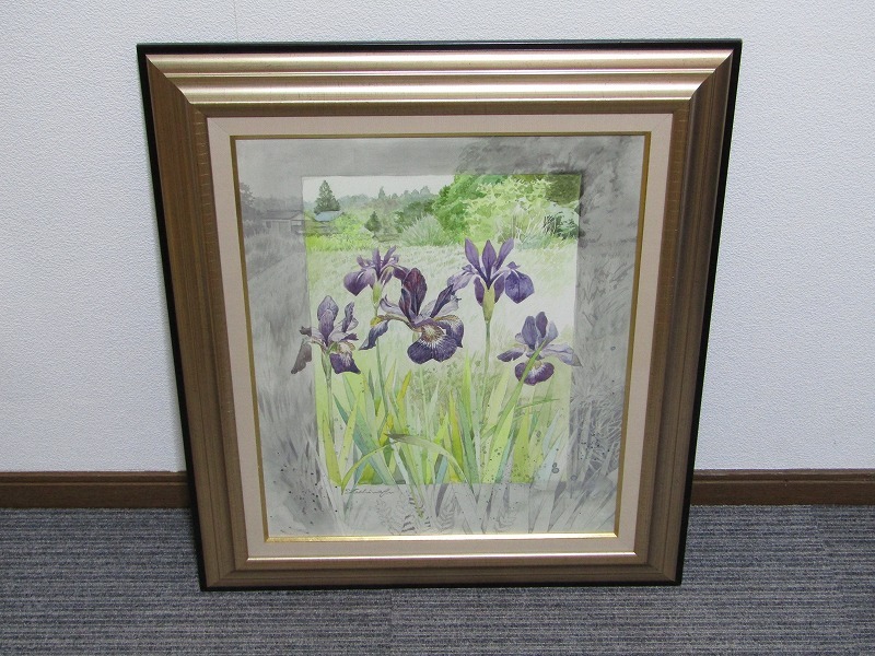 - 【真作】かんのよしのぶ 水彩 8号「アヤメ咲く野辺」額装 直筆サイン 一枚の絵取扱 淡彩人気画家 ef26-9934[OTO]