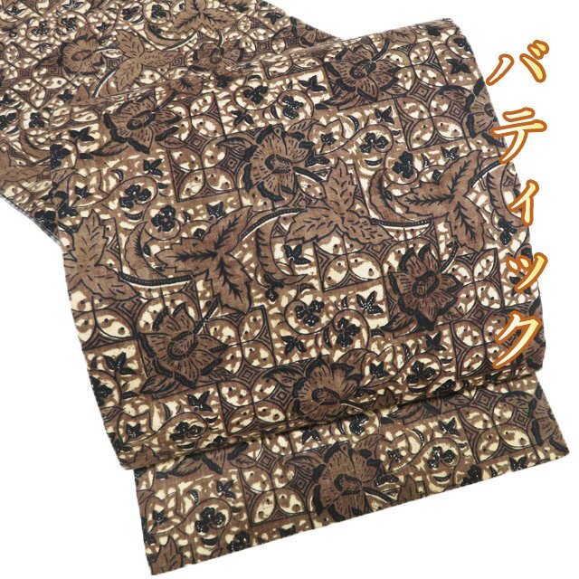 > 袋帯 中古 リサイクル 正絹 カジュアル 仕立て上がり 六通 バティック batik 植物文様 茶系色 多色 きもの北條 A1199-14