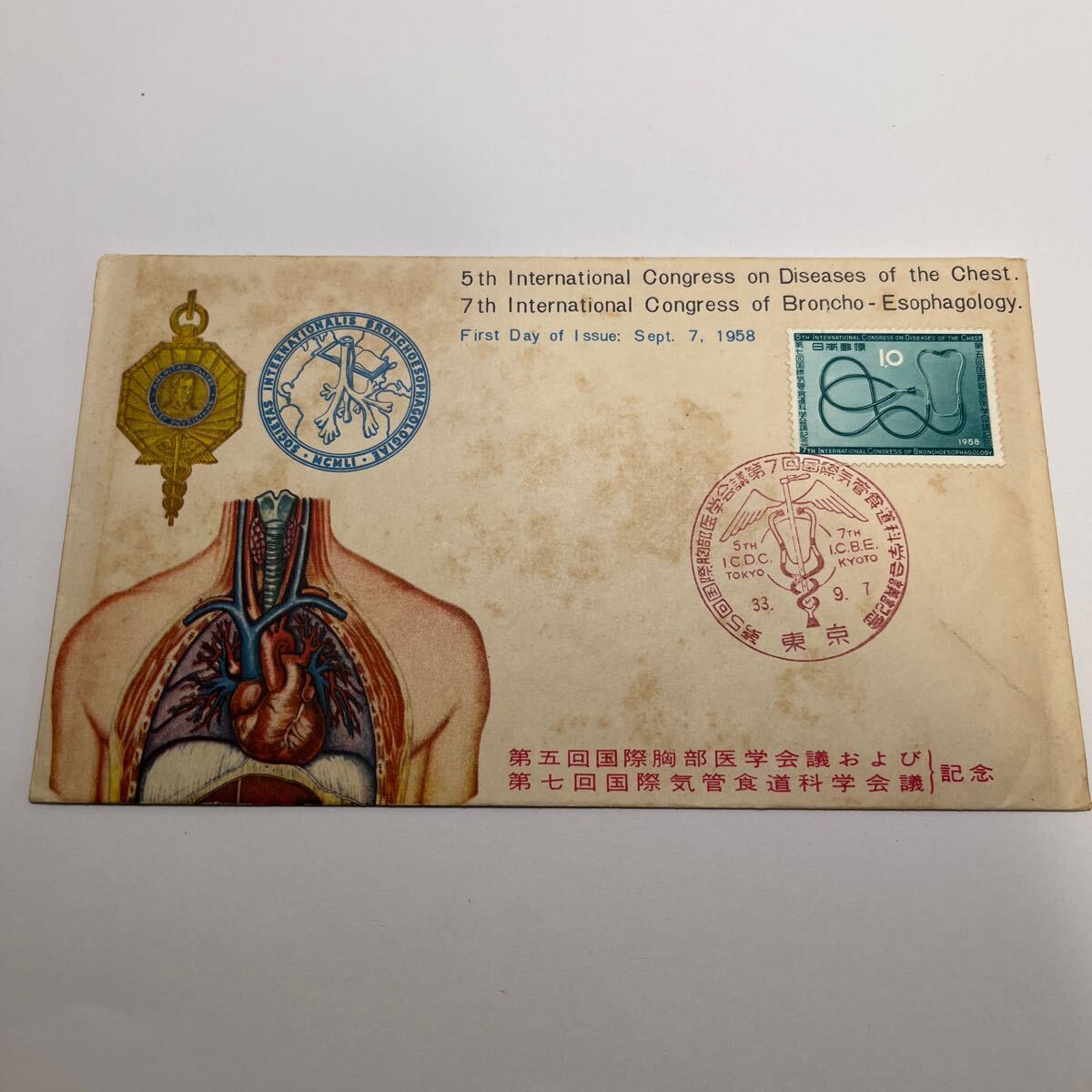 - 国際胸部医学会議、器官食道科学会議記念切手 初日カバー First day Cover 昭和33年 東京印 【送料110円】『OA1』