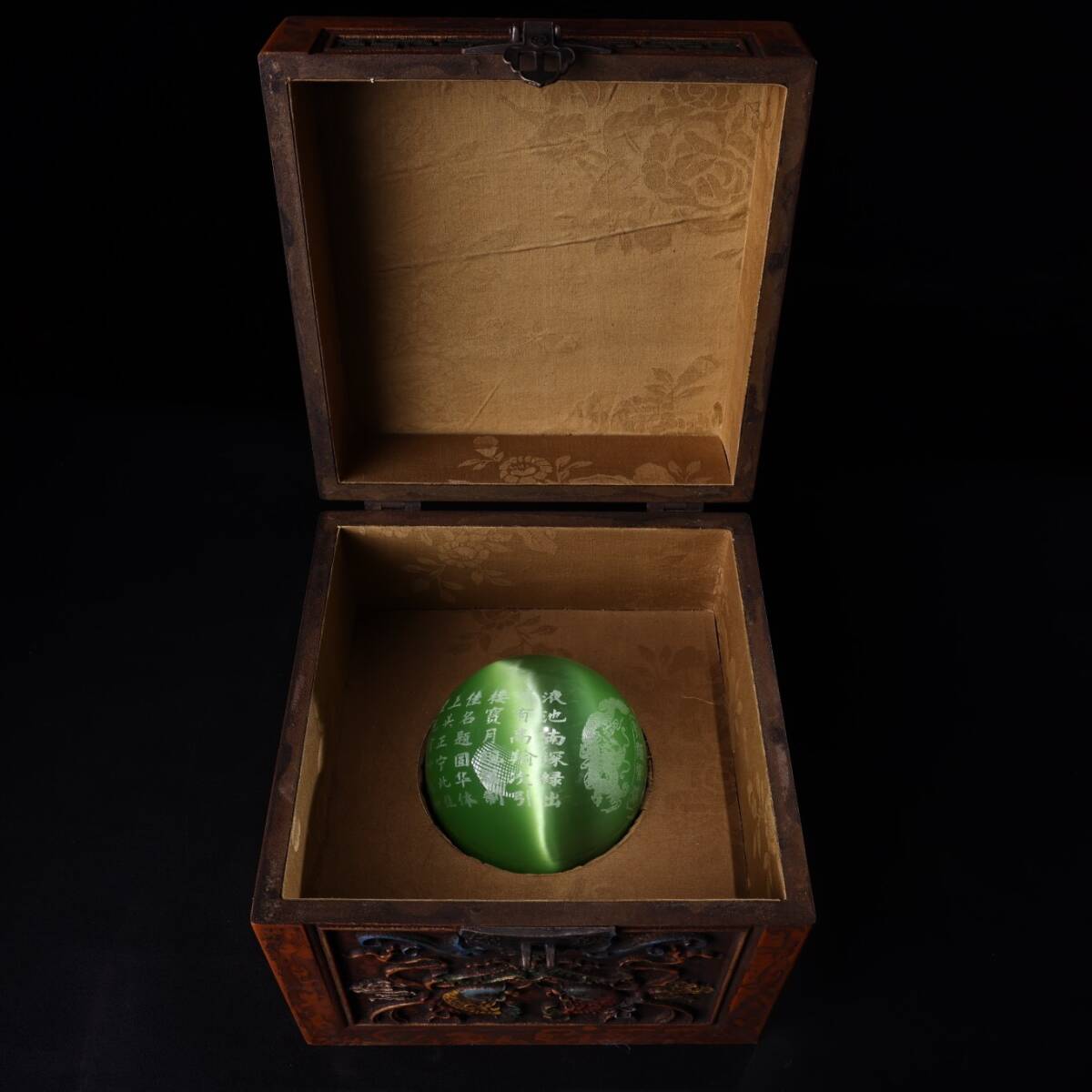 - 蔵友旧蔵出 猫眼石製 細密彫 銘文 綠猫眼手球 箱付 希少珍品 貴重品 置物 古賞物 中国古玩 中国古美術品
