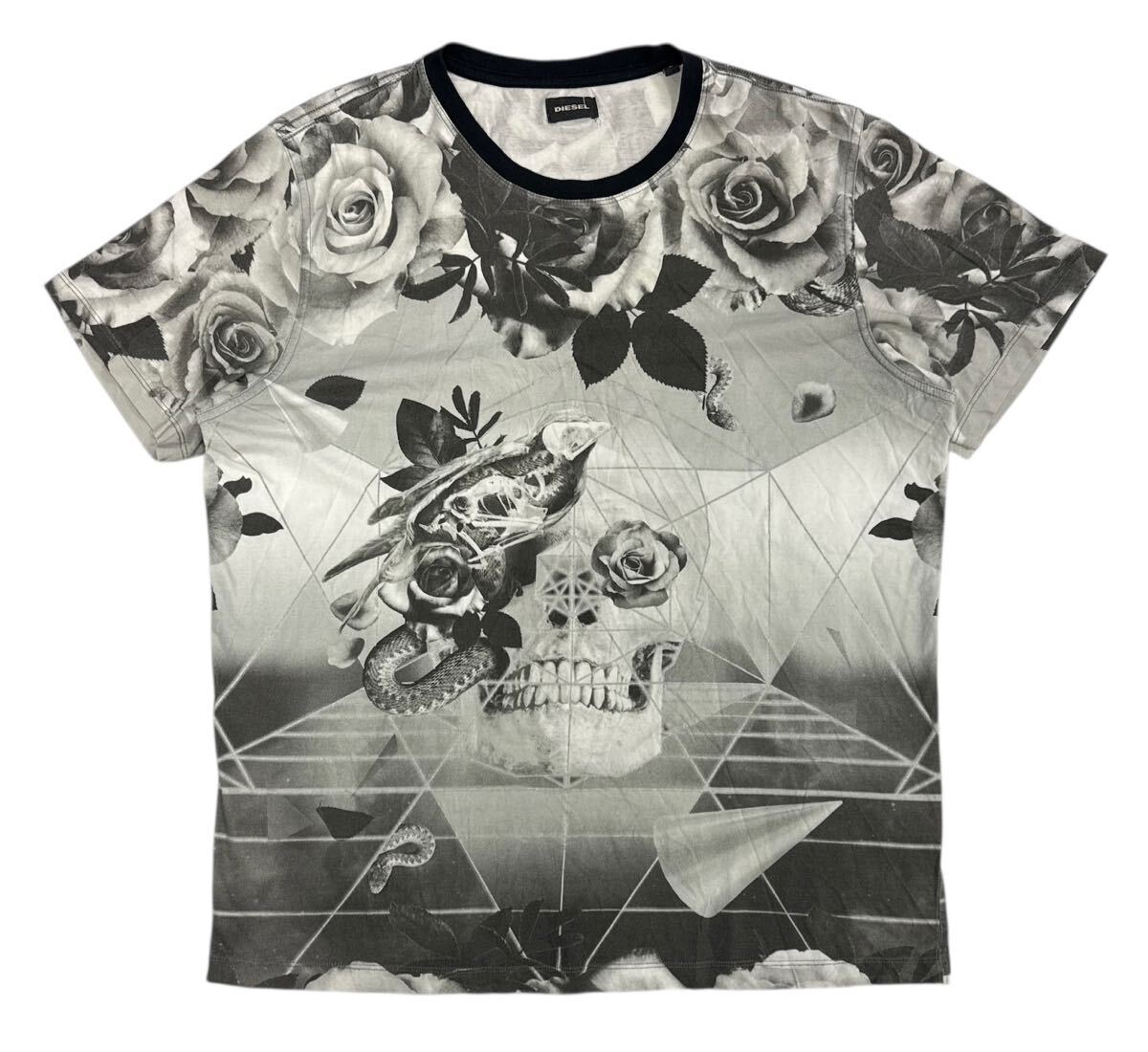 - 送料無料 ○ DIESEL ディーゼル ○ スカル ローズ フォト モノクロ 転写プリント 半袖 Tシャツ L